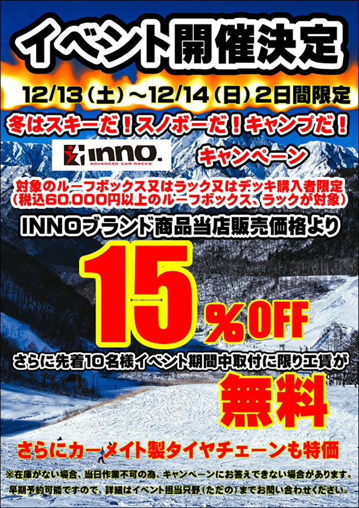 Pick Up新着情報 イベント その他 【緊急告知!!】冬はスキーだ!スノボだ!RV-INNOキャリアキャンペーン開催決定!! イベント その他 12月20日(土)車系YouTuber NUNUさんがやって来る!! イベント その他 超KeePer祭!開催 イベント スポーツ・ドレスアップ RECARO純正ベースフレームプレゼントキャンペーンを開催中! 新商品 タイヤ・ホイール 冬将軍到来!冬タイヤが種類豊富で、どこよりも安い!! イベント スポーツ・ドレスアップ 今年の冬も開催します。12社が集まるスバル合同イベント! イベント スポーツ・ドレスアップ 11月8日・9日の2日間!BLITZ CIVICフェア開催! お知らせ お知らせ 夏⇔冬タイヤ交換のお客様へのご案内 イベント スポーツ・ドレスアップ 10月25日・26日の2日間、レボリューションイベント開催 イベント スポーツ・ドレスアップ 8/1(金)〜31(日) FUJITSUBOイベント開催決定 イベント タイヤ・ホイール ミシュランタイヤフェア開催! イベント タイヤ・ホイール 7/5・7/6 アルミホイール鍛造フェア開催 1 / 212» Event-イベント情報-詳しくはこちら > タイヤ・ホイール オーディオ・ナビ スポーツ・ドレスアップ PITサービス その他 Item-新商品情報-詳しくはこちら > タイヤ・ホイール オーディオ・ナビ カー用品 スポーツ・ドレスアップ PITサービス その他